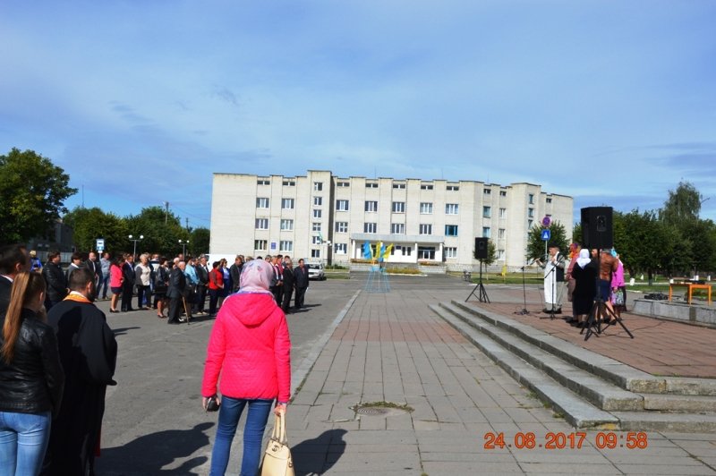 Настоятель Преображенського храму селища протоієрей Димитрій Юхимук з хористами і присутніми на площі в молитві до Бога просив благословення нашій державі, мудрості її правителям, Божої допомоги її воїнам, миру на нашій землі.