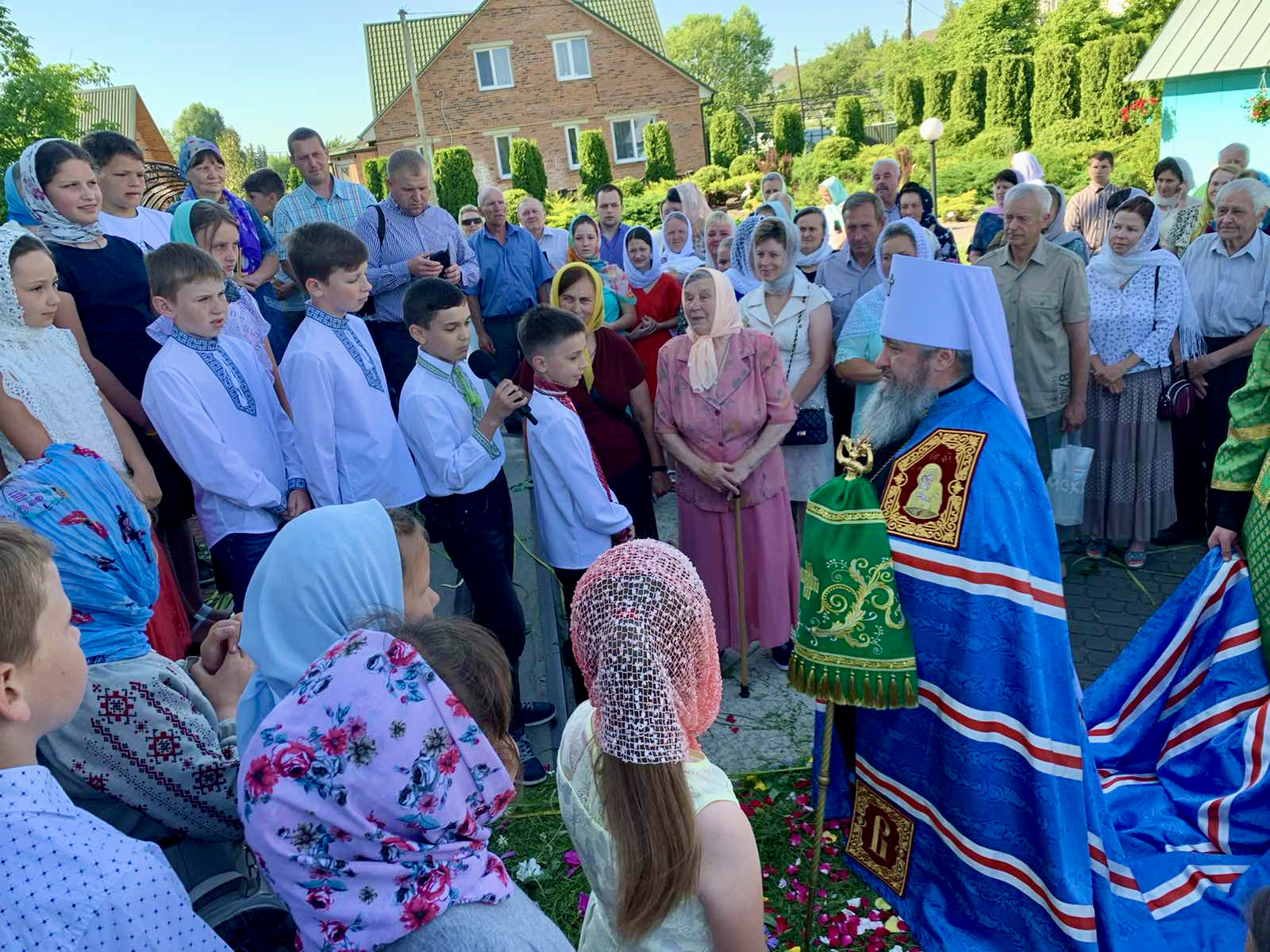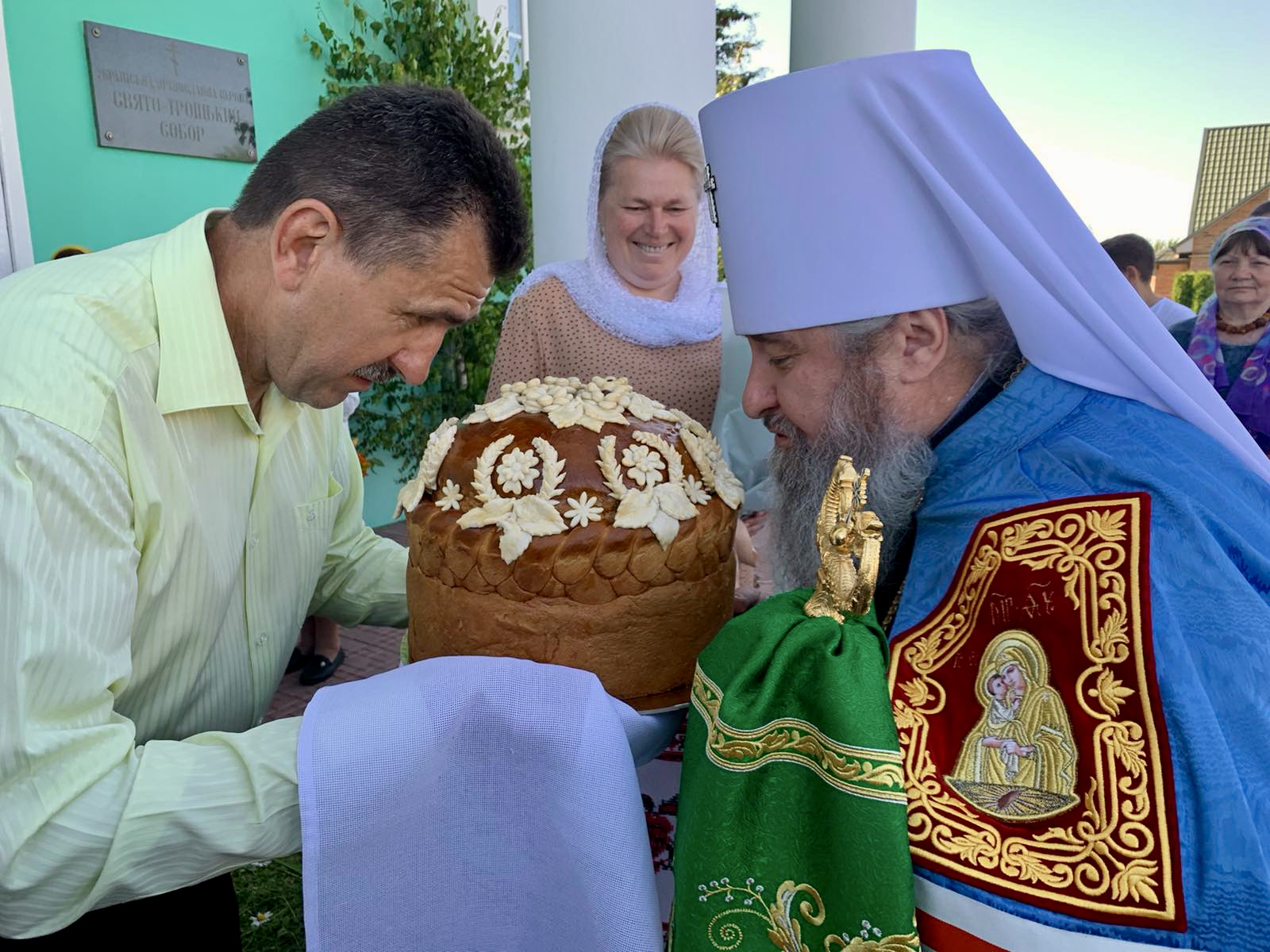 Владику Володимира зустріли на подвір’ї собору-іменинника чисельні парафіяни, священники та діти – вихованці місцевої Недільної школи. Зустріли, як належить зустрічати дорогого гостя – хлібом, сіллю та щирими вітаннями. Митрополит усіх благословив, а діткам подарував на молитовну пам’ять іконочки з підписом-благословенням Владики.