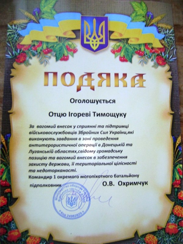 Дорогі юнаки та дівчата, непохитної вам віри, яка дає можливість власним розумом та власними руками творити своє майбутнє, будувати цивілізовану українську державу. А кожному навчальному закладу мати в музеї такий скарб.